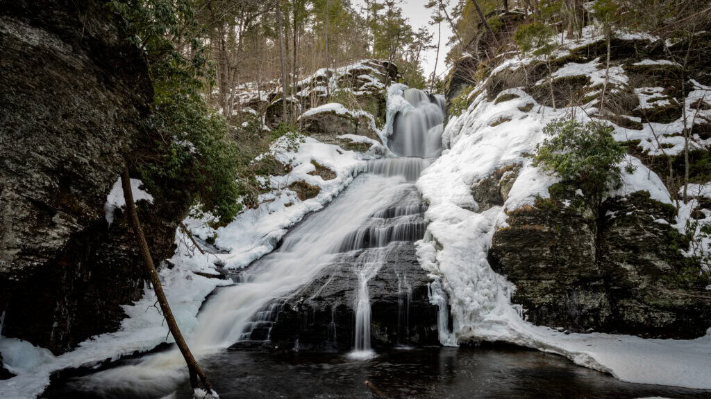 No matter where you are in the Poconos, great hiking is always close, but you might consider a trip to the Delaware Water Gap National Recreation Area, a massive natural area with popular waterfalls and beautiful scenery. Here, the Delaware River flows through the Pocono Mountains—creating a dramatic “gap” in an area with more than 150 miles of hiking trails. The George W. Childs Park Trail, about 1.5 miles long, is a relatively easy trek that takes hikers past three waterfalls worth the journey, even when frozen.