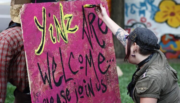 An activist paints a welcoming message in the Pittsburgh dialect. (Sage Ross/CC BY-SA 2.0)