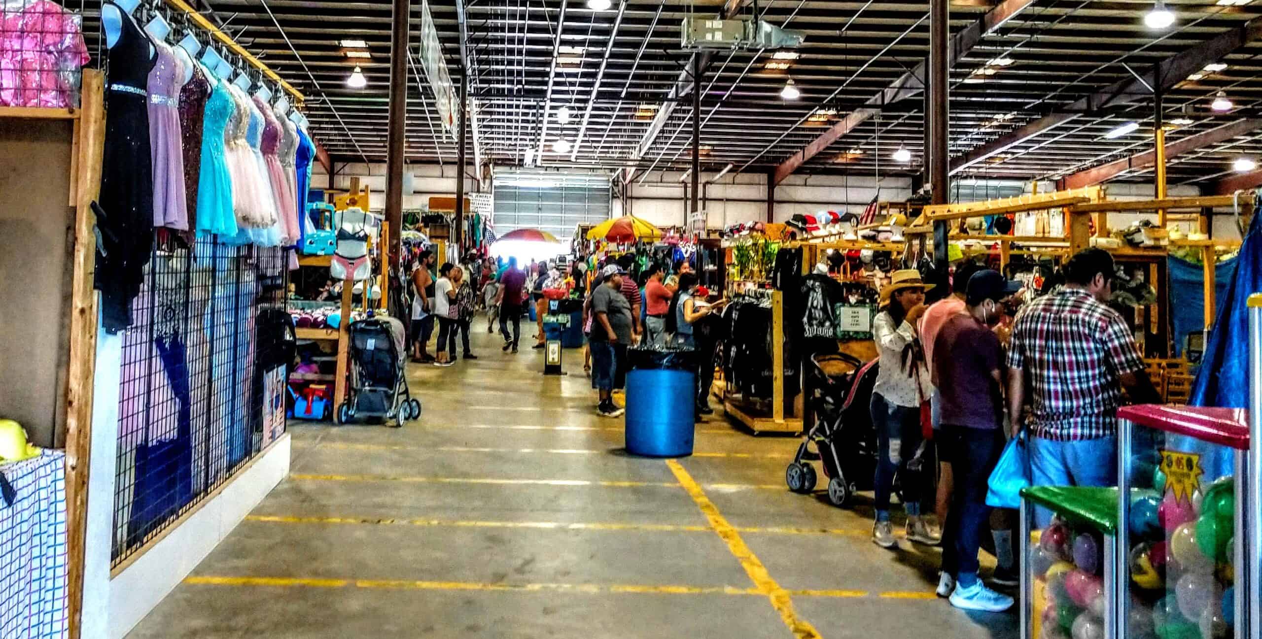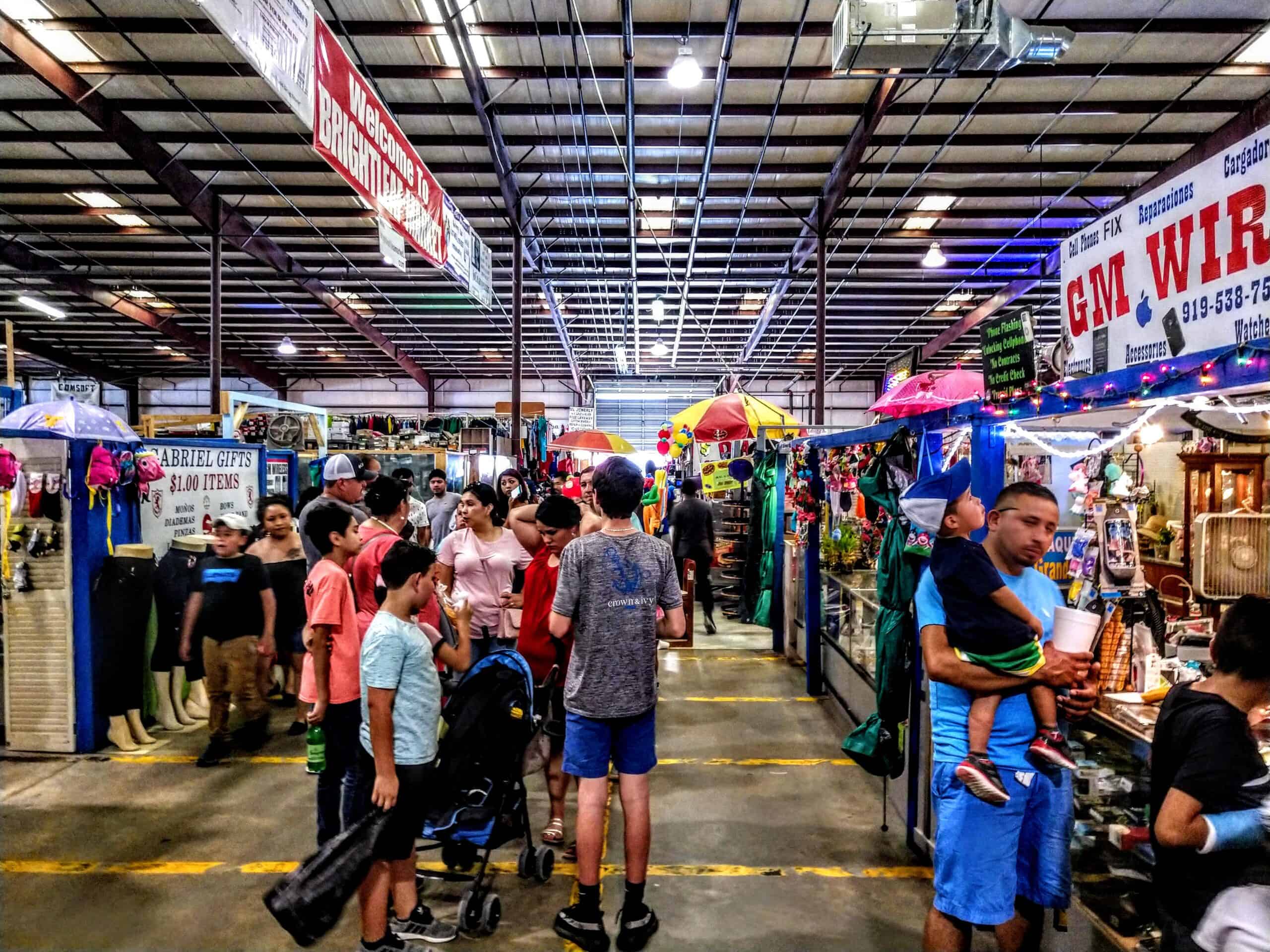 Brightleaf Flea Market features more than 100,000 square feet of indoor market space, including a fresh vegetable market. Vendors sell everything from clothing, including for quinceañeras, work uniforms, and western wear, to furniture, hardware, electronics, appliances, and specialty items, such as antiques, pool and air hockey tables, car parts, and custom candles.